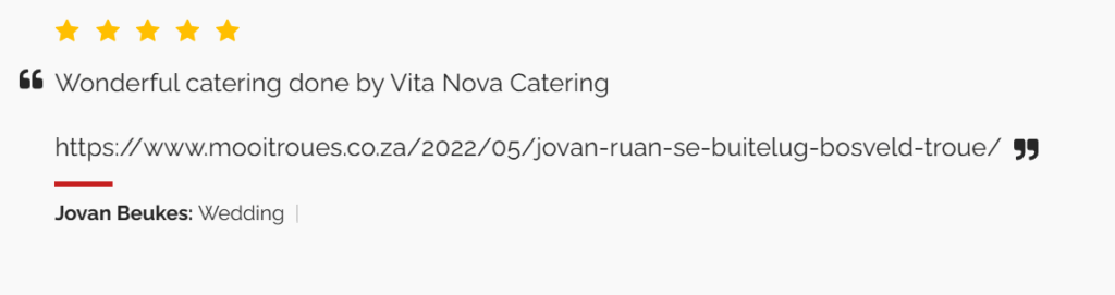 Vita Nova Management provides end-to-end catering for corporate functions, sporting occasions, safari experiences, private gatherings, weddings, and exclusive private chef services. Based in Gauteng, we excel in off-site catering tailored to your vision anywhere in South-Africa.